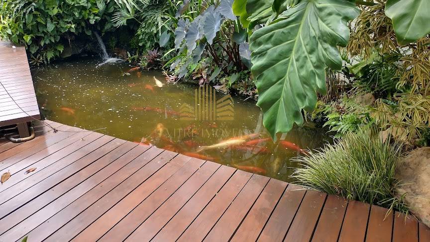 Lago ornamental com carpas, irrigação automatizada, PABX em todos os cômodos e jardins que abraçam todos os ambientes