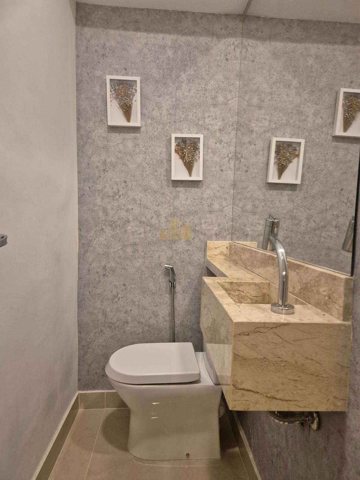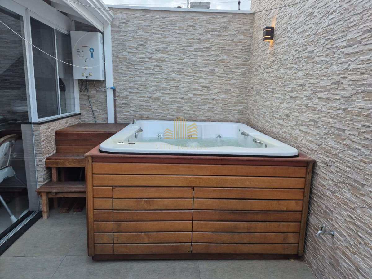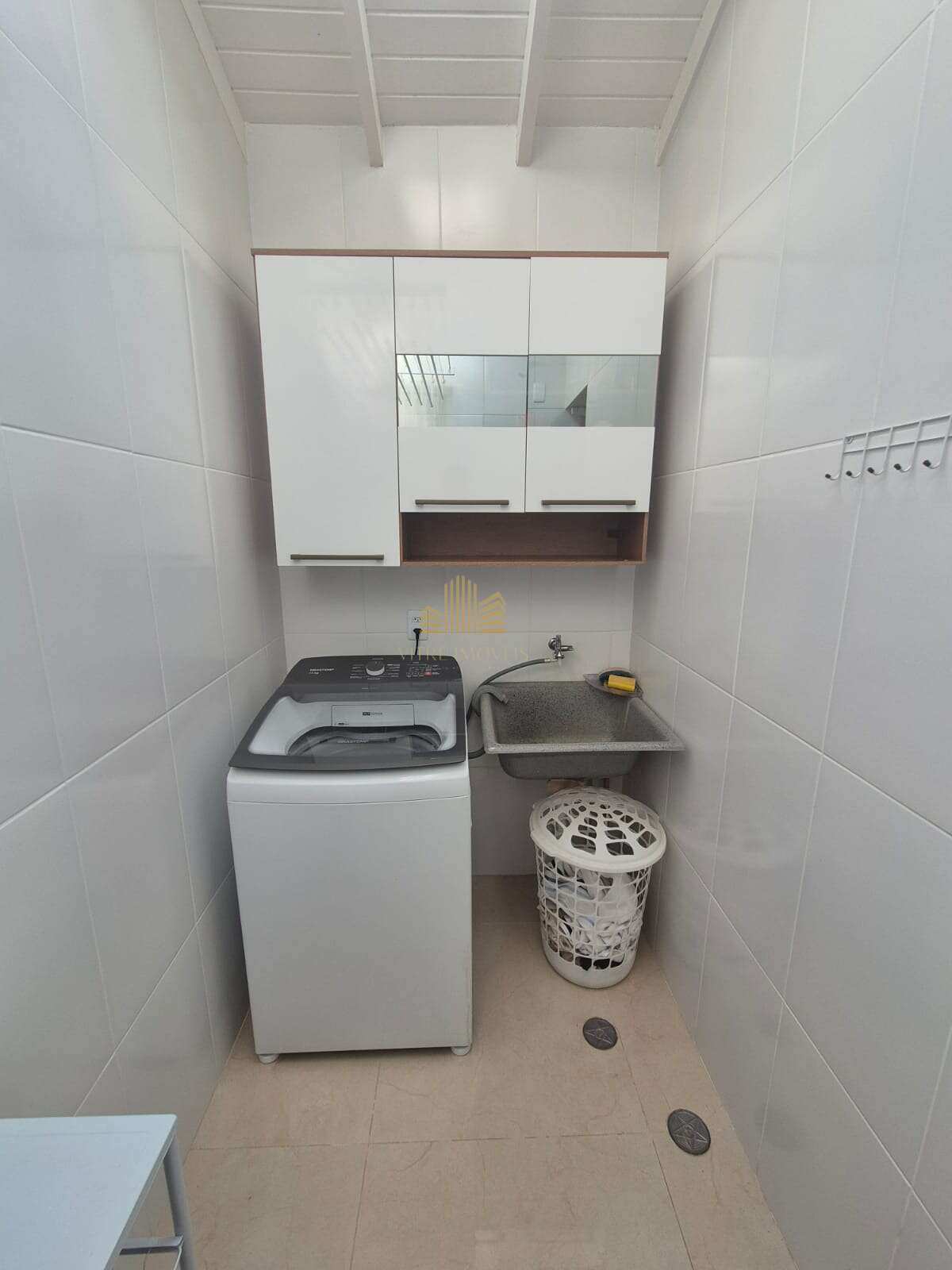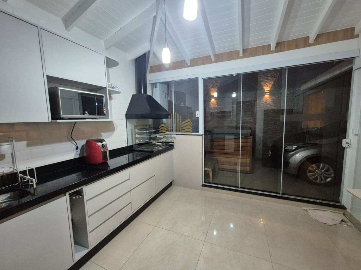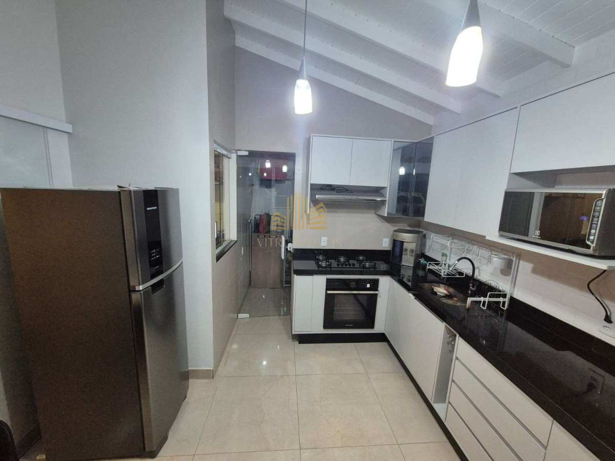 Com acabamentos em laminado, mármore e porcelanato, a casa ainda conta com armários planejados em diversos cômodos.